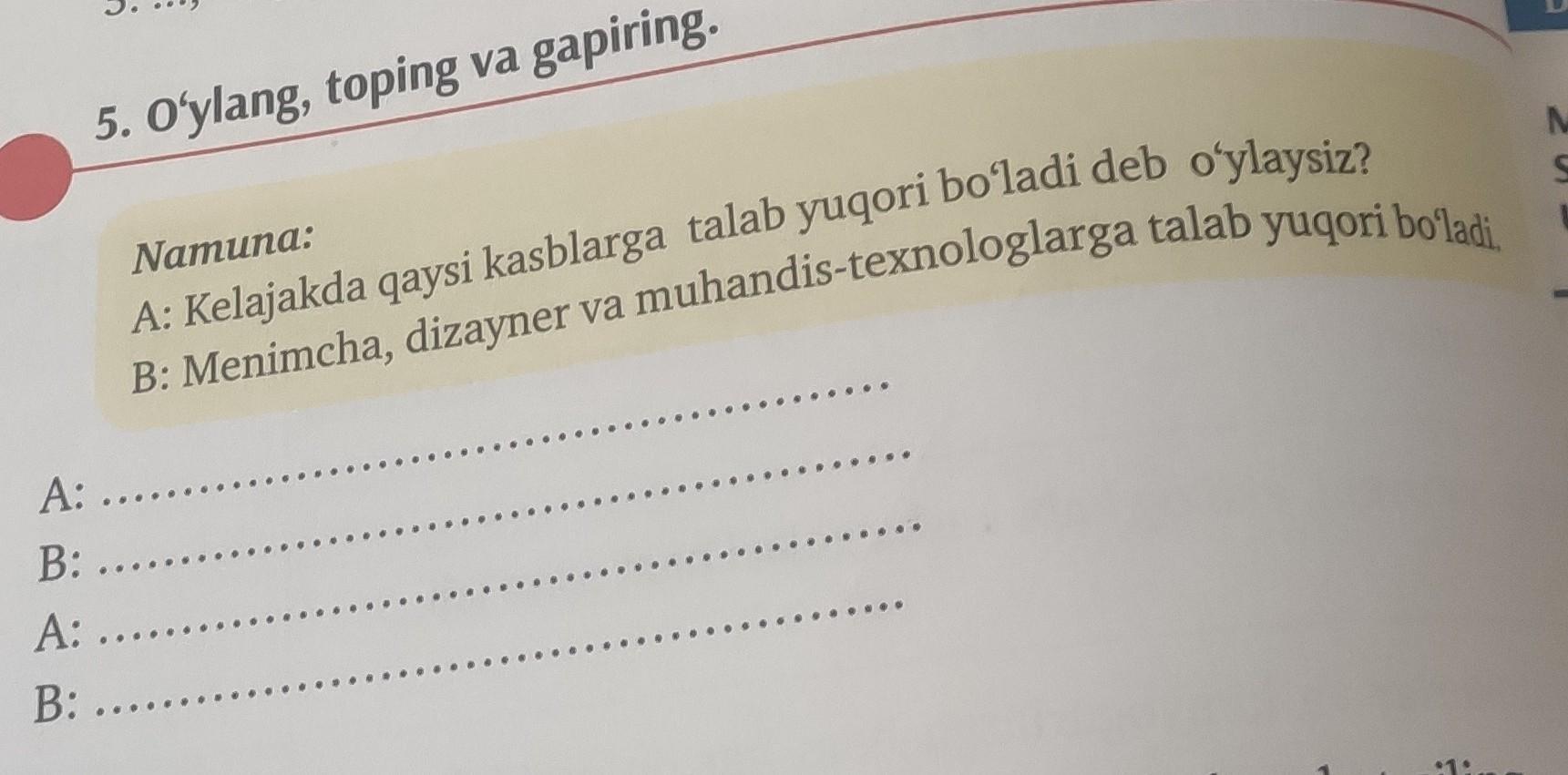 5. O'ylang, toping va gapiring. Namuna: A: Kelajakda qaysi kasblarga talab yuqori bo'ladi deb o'ylaysiz? B: Menimcha, dizayner va muhandis-texnologlarga talab yuqori bo'ladi. A: ... B: ...... A: ...... B: ...