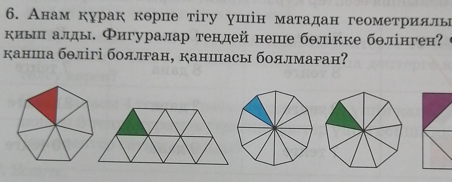 6. Анам құрақ көрпе тігу үшін матадан геометриялық пішіндер қиып алды. Фигуралар теңдей неше бөлікке бөлінген? Фигураның қанша бөлігі боялған, қаншасы боялмаған?