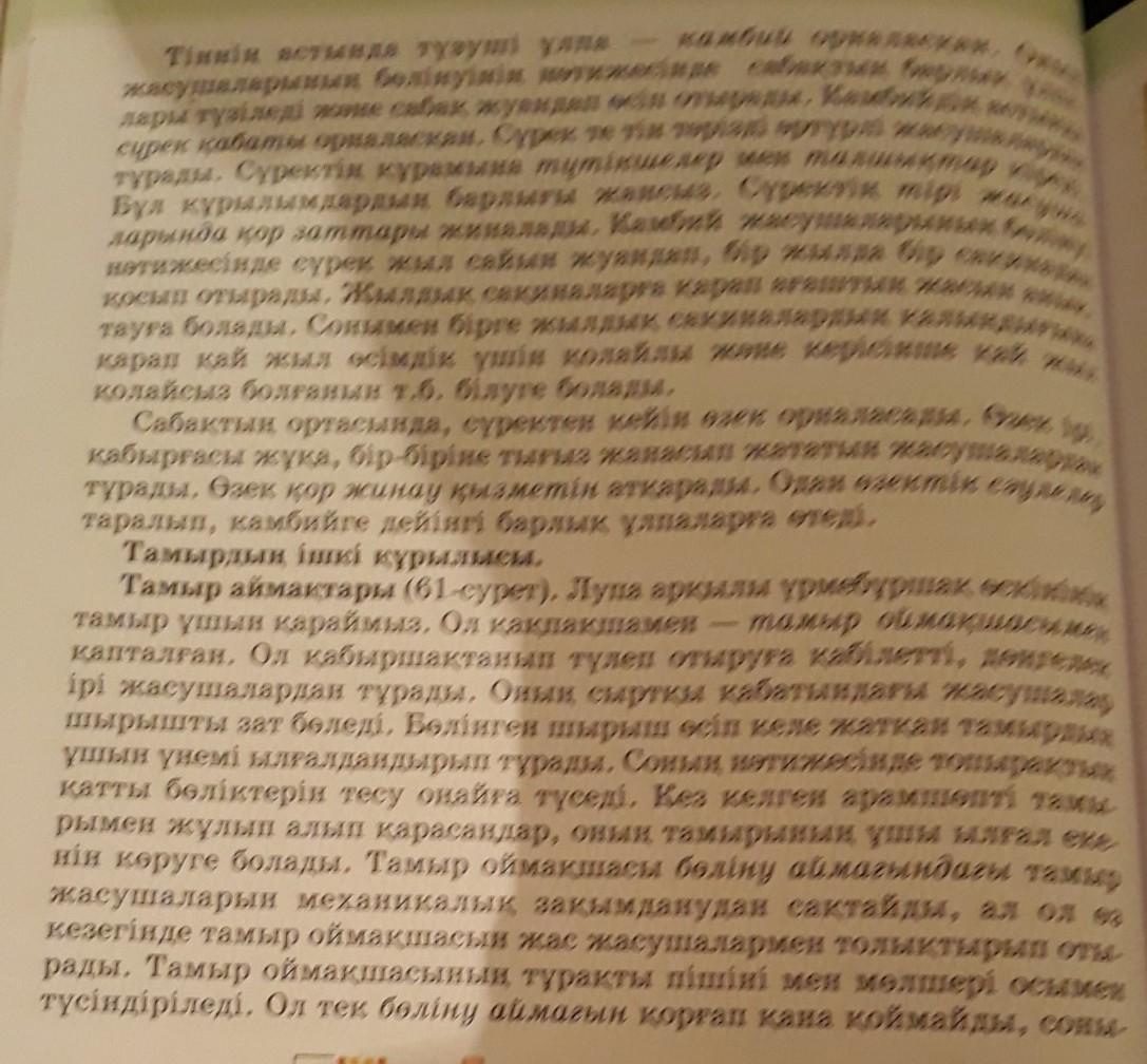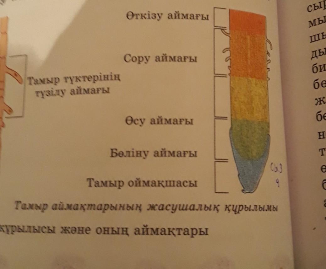 6. Тамыр аймақтарын зерттеу бойынша қорытынды жасаңдар. а) Тамырда келесі аймақтар бөлінеді ә) Тамырдың ұшы кіп-кішкене қалпақшамен жабылған - аймақтары. б) Тамыр талшықтары келесі аймақта орналасқан в) Тамыр қабықшасы астында орналасқан аймақ. г) Жас тамырдың ұзаруы есебінен болады д) Бұл аймақтың жасушалары – ұзын іші қуыс қалың қабықшасы бар ..... аймағы жасушалары