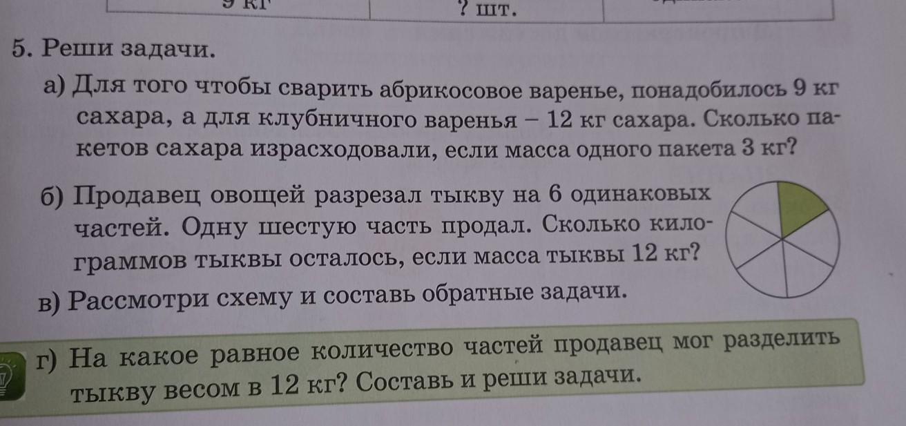 б) Масса тыквы 12 кг. Продавец разрезал тыкву на равные(одинаковые) части. Одну часть продал. Осталось 10 кг. На сколько частей разрезал тыкву продавец?