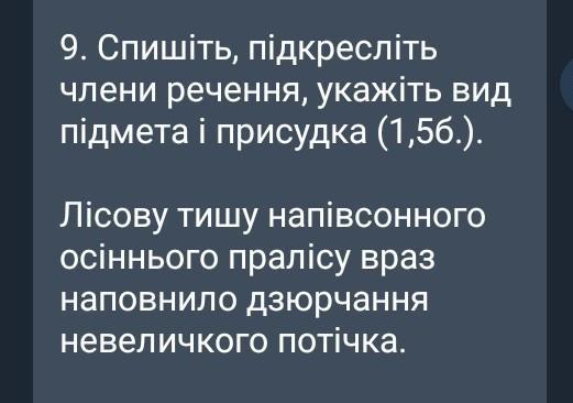 Лісову тишу напівсонного осіннього пралісу враз наповнило (дієсл.) дзюрчання (ім.) невеличкого потічка.