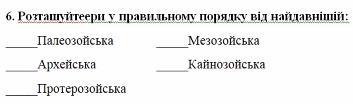 Ответ: 3-палеозойська; 5-Архейська; 4-Протезойська; 2-Мезозойська; 1-Кайнозойська.