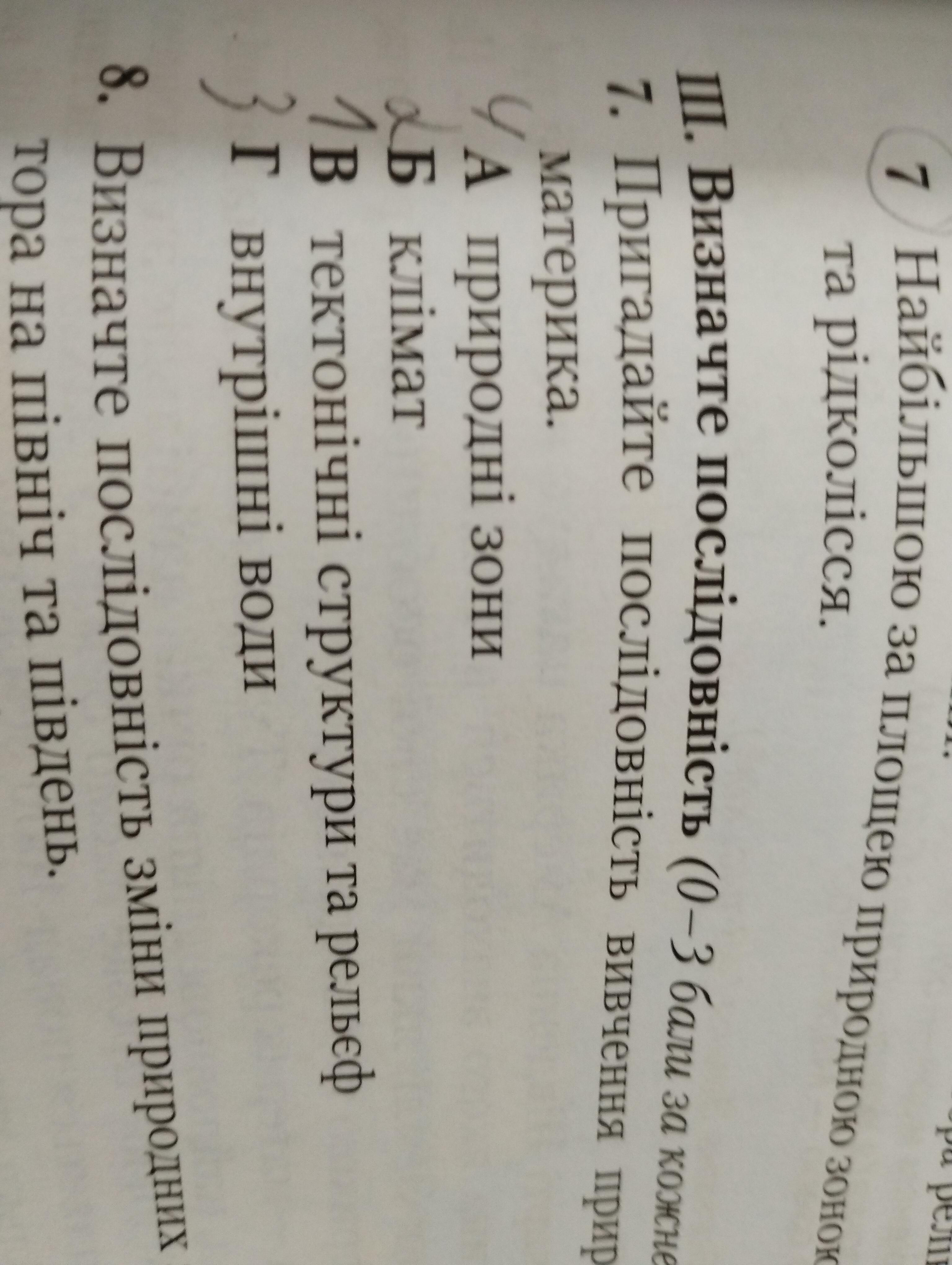 III. Визначте послідовність (0-3 бали за кожне завдання). 7. Пригадайте послідовність вивчення природних компонентів материка. А природні зони Б клімат В тектонічні структури та рельеф 4 Г внутрішні води