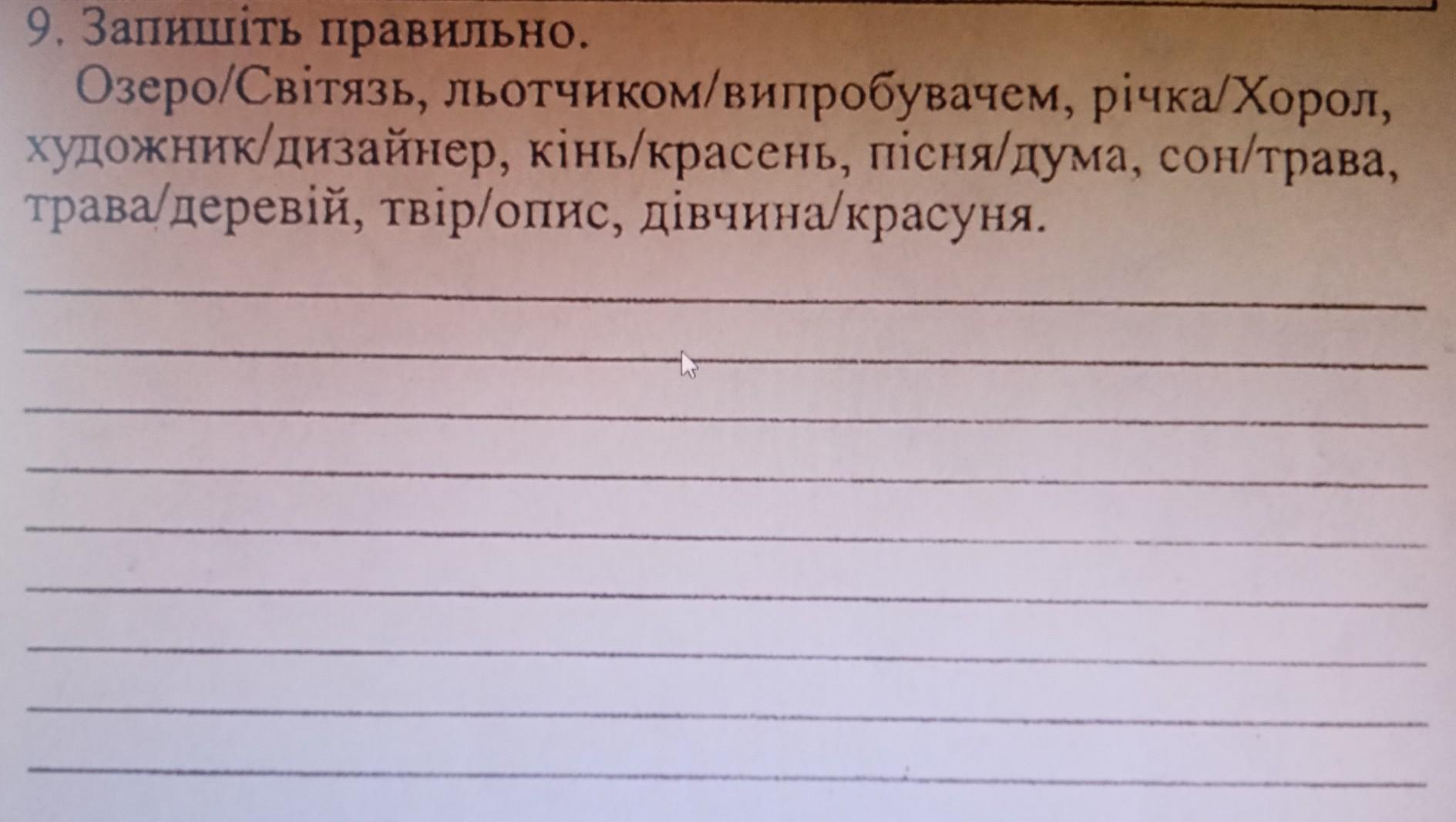 9. (Запишіть правильно) . Озеро/Світязь, льотчиком/випробувачем, рiчка/хорол, художник/дизайнер, кiнь/красень, пiсня/дума, сон/трава, трава/деревій, твір/опис, дівчина/красуня.
