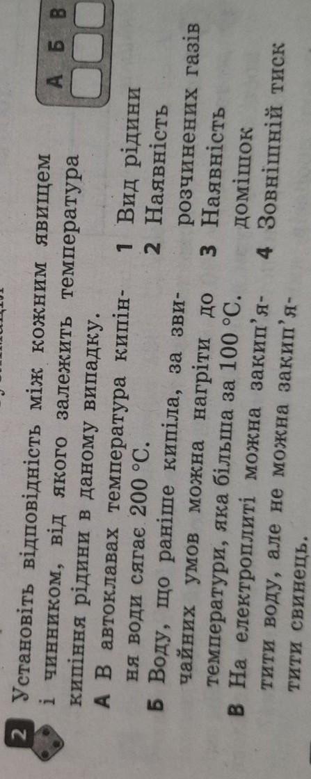Установіть відповідність між кожним явищем і чинником, від якого залежить температура кипіння рідини в даному випадку. A B автоклавах температура кипін- ня води сягає 200 °С. Б воду, що раніше кипіла, за зви чайних умов можна нагріти до температури, яка більша за 100 °С. в на електроплиті можна закип'я- тити воду, але не можна закип'я- тити свинець. А Б В 1 Вид рідини 2 Наявність розчинених газів 3 Наявність домішок 4 Зовнішній тиск