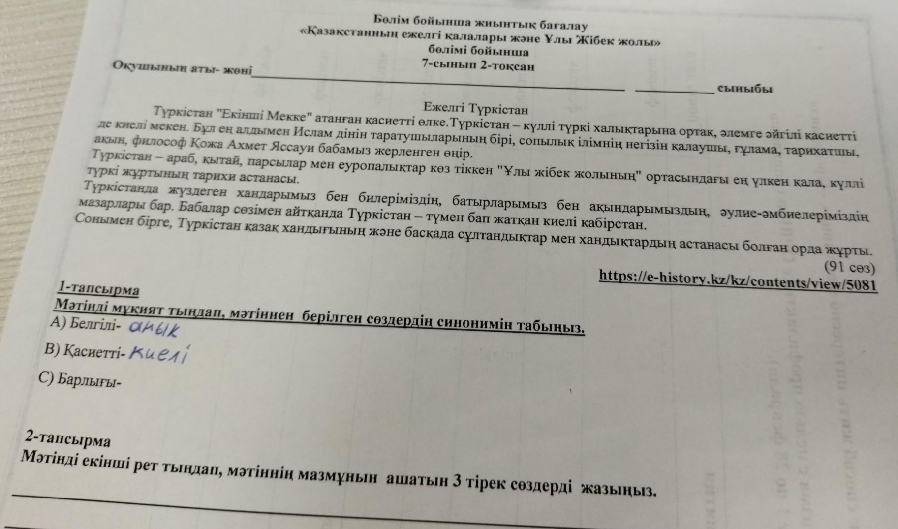 2-тапсырма Мәтінді екінші рет тындап, мәтіннің мазмұнын ашатын 3 тірек сөздерді жазыңыз.