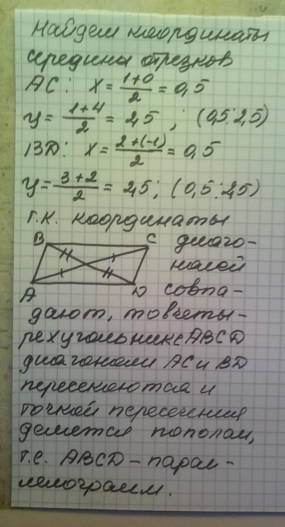 Дано чотири точки: А(1;1), В(2;3) С(0:4) D(-1;2) Довести, що чотирикутник АBCD - параллелограмм.