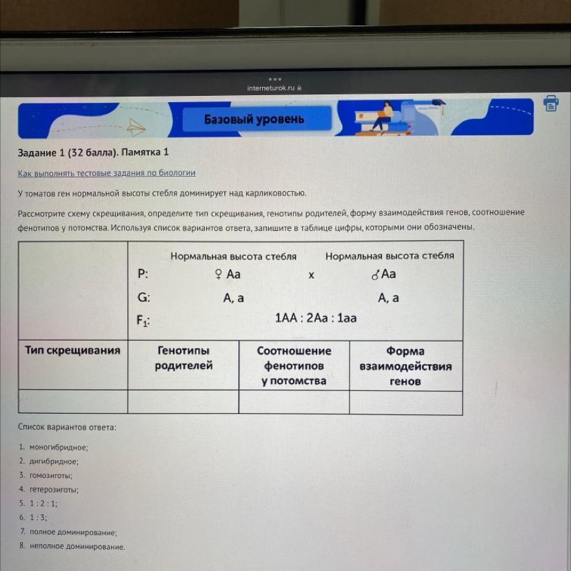 фенотипов у потомства. Используя список вариантов ответа, запишите в таблице цифры, которыми они обозначены.