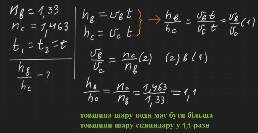 Показник заломлення води 1,33, скипидару - 1,463. У скільки разів товщина шару води має бути більша шару скипидару, щоб час розповсюдження променя світла в обох випадкaх був однаковий?