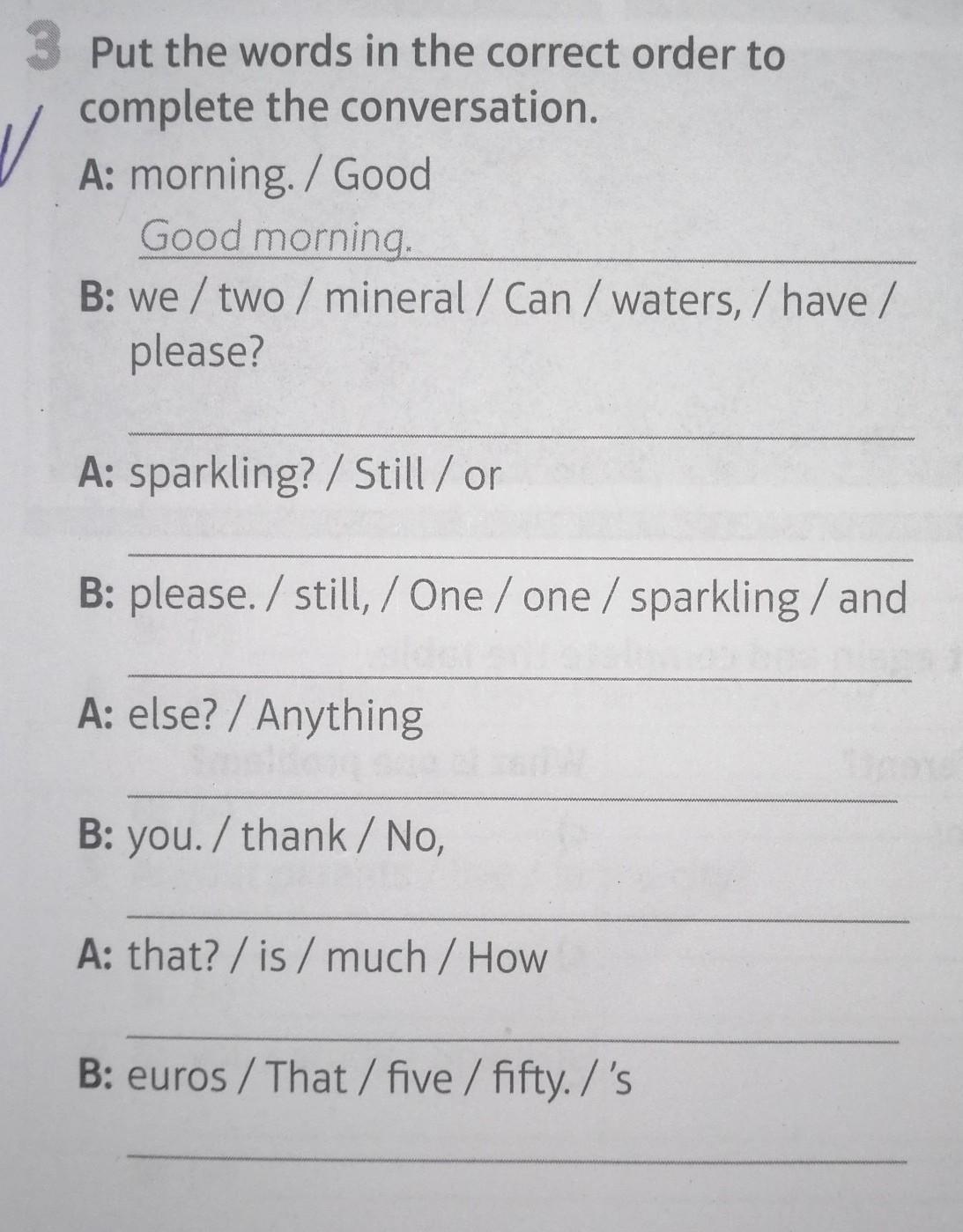 B: Can we have two mineral waters, please?