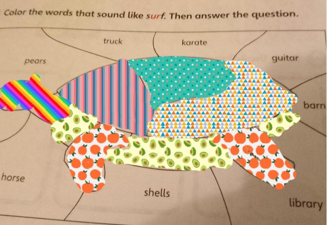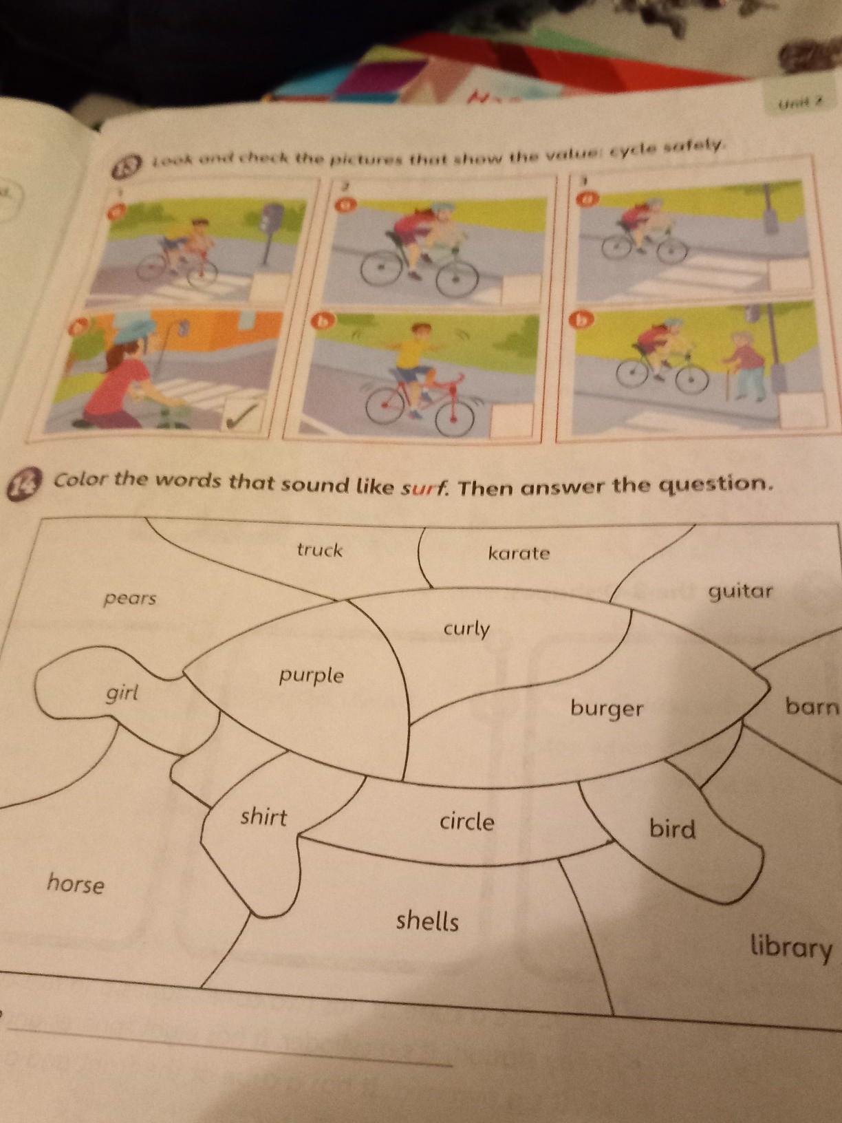 13 Look and check the pictures that show the value: cycle safely. 1 3 What is it? pears 14 Color the words that sound like surf. Then answer the question. girl 2 horse truck purple shirt karate curly circle ofo shells burger Unit 2 guitar bird barn library