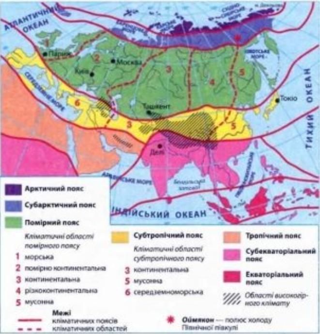 - 1 На контурній карті позначени межі поширення помірного і тропічного кліматичних поясів. Способом якісного фону зображени області помірного клімату – континентального, помірно континентального, морського, мусонного, області тропічного клімату – пустельного і вологого.