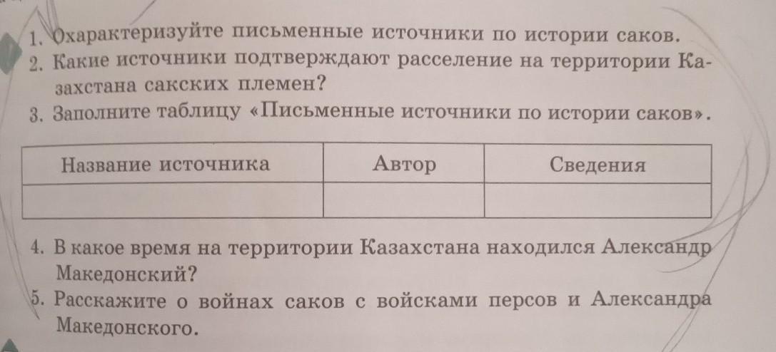 1. Охарактеризуйте письменные источники по истории 2. Какие источники подтверждают расселение на территории Ка- захстана сакских племен, 3. Заполните таблицу «Письменные источники по истории саков». Название источника Сведения Автор 4. В какое время на территории Казахстана находился Александр Македонский, 5. Расскажите о войнах саков с войсками персов и Александра Македонского. от ветьте пожалуйста на 5и4ю пожалуйста