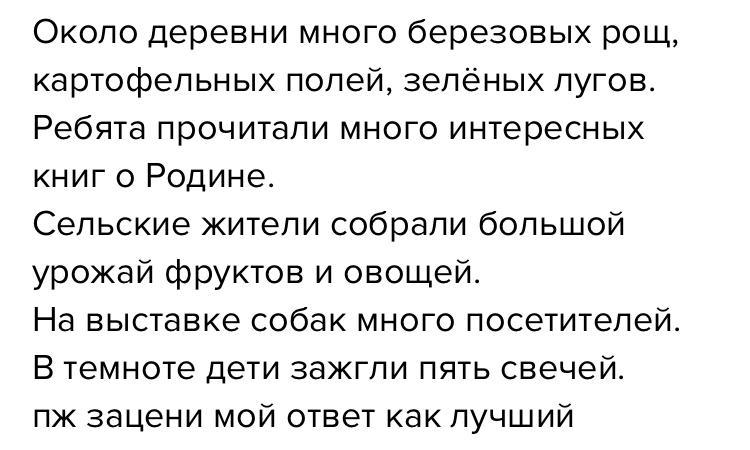 4. Спиши предложения, используя имена существительные, данные в скобках, в форме родительного падежа. 1. Около деревни много берёзовых (рощи), картофельных (поля), зелёных (луга). 2. Ребя- та прочитали много интересных (книги) о ро- дине. 3. Сельские2 жители собрали большой урожай (фрукты) и (овощи). 4. На выставке (собаки) много (посетители). 5. В темноте дети зажгли пять (свечи). урожай посетитель MED BY