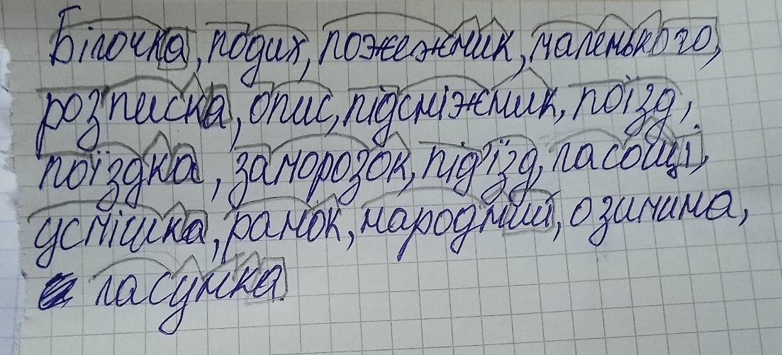 Розібрати за будовою слова: білочка , подих , пожежник, маленького , розписка , опис, підсніжник , поїзд , поїздка , заморозок , під ' їзд , ласощі , усмішка , ранок, народний , озимина , ласунка.