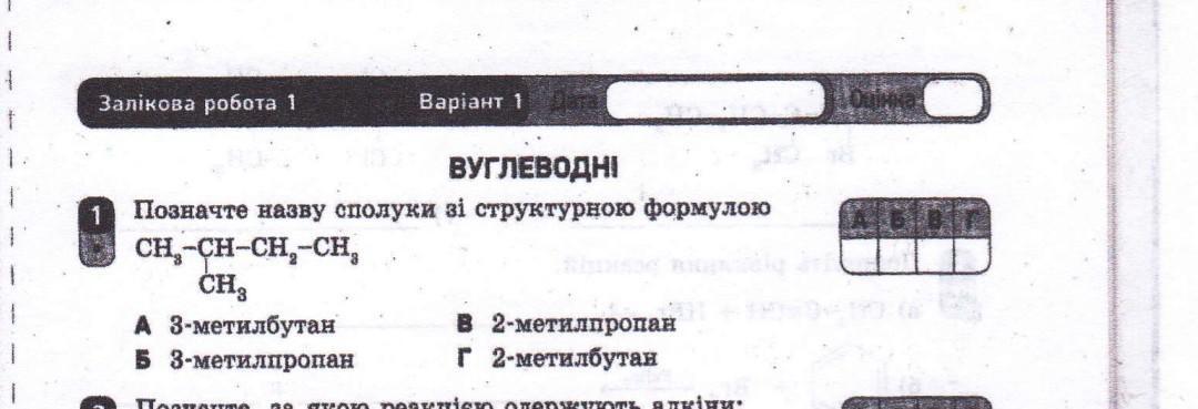 1 Позначте назву сполуки зі структурною формулою CH₂-CH-CH₂-CH₂ CHS А 3-метилбутан Б 3-метилпропан Варіант 1 ToonerTTO Во в 2-метилпропан г 2-метилбутан посовер піни:
