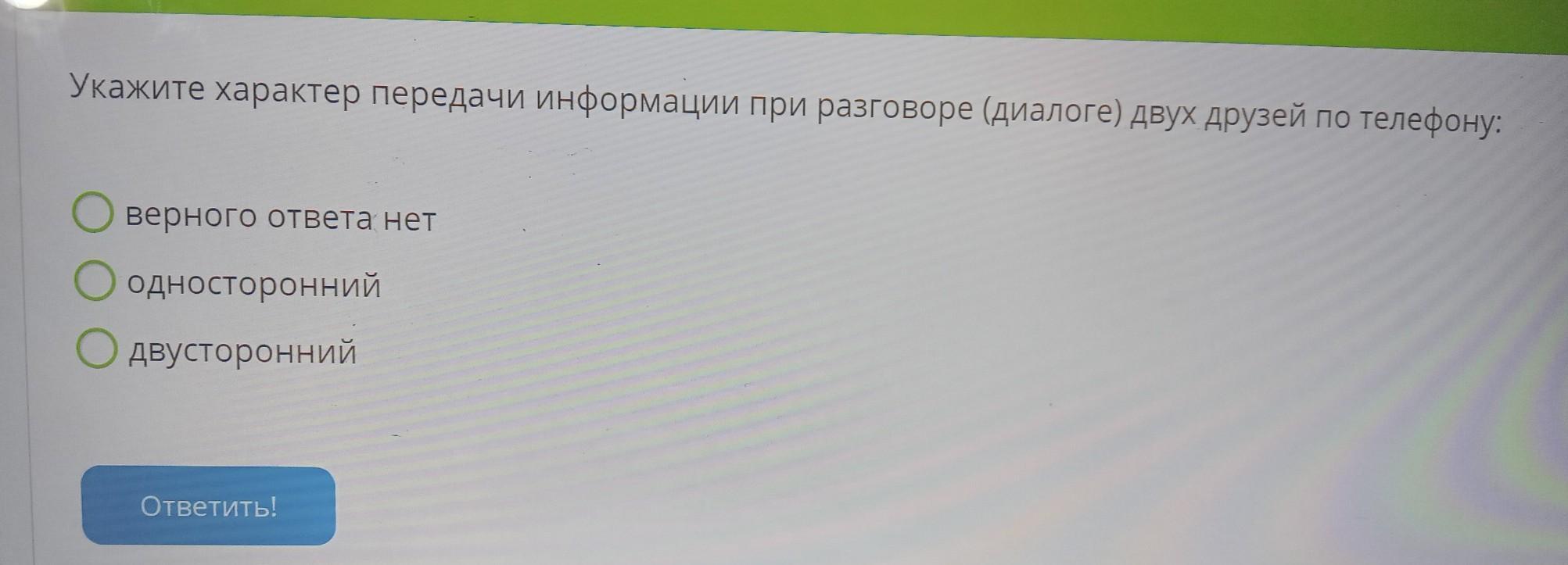 Укажите характер передачи информации при разговоре (диалоге) двух друзей по телефону: верного ответа нет односторонний двусторонний.