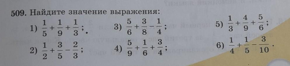 509. Найдите значение выражения: 5 1 1 1) + + 5 9 2) 1 2 + 35 1 ©0|19 CÓ 3 2 3 3) 4) 6 5 9 + + 1 8 4 1 3 + 3 6 4 ER N 5) 6) 4 5 9 6 1 3 1 1 + 4 5 3 10