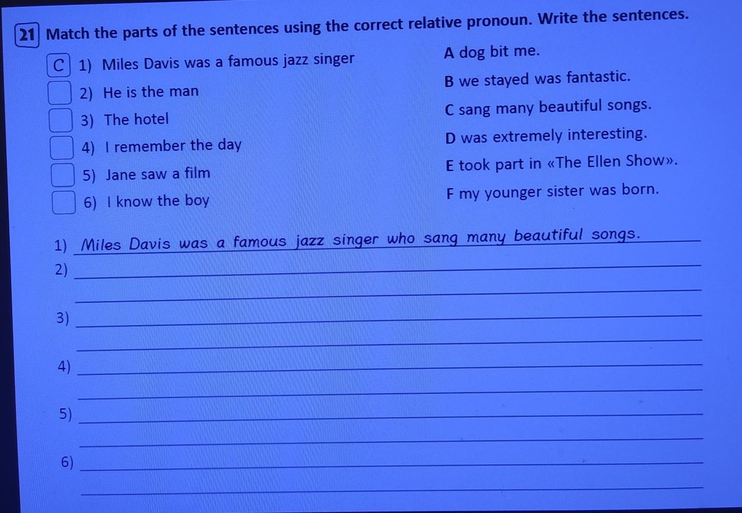 21 Match the parts of the sentences using the correct relative pronoun. Write the sentences.