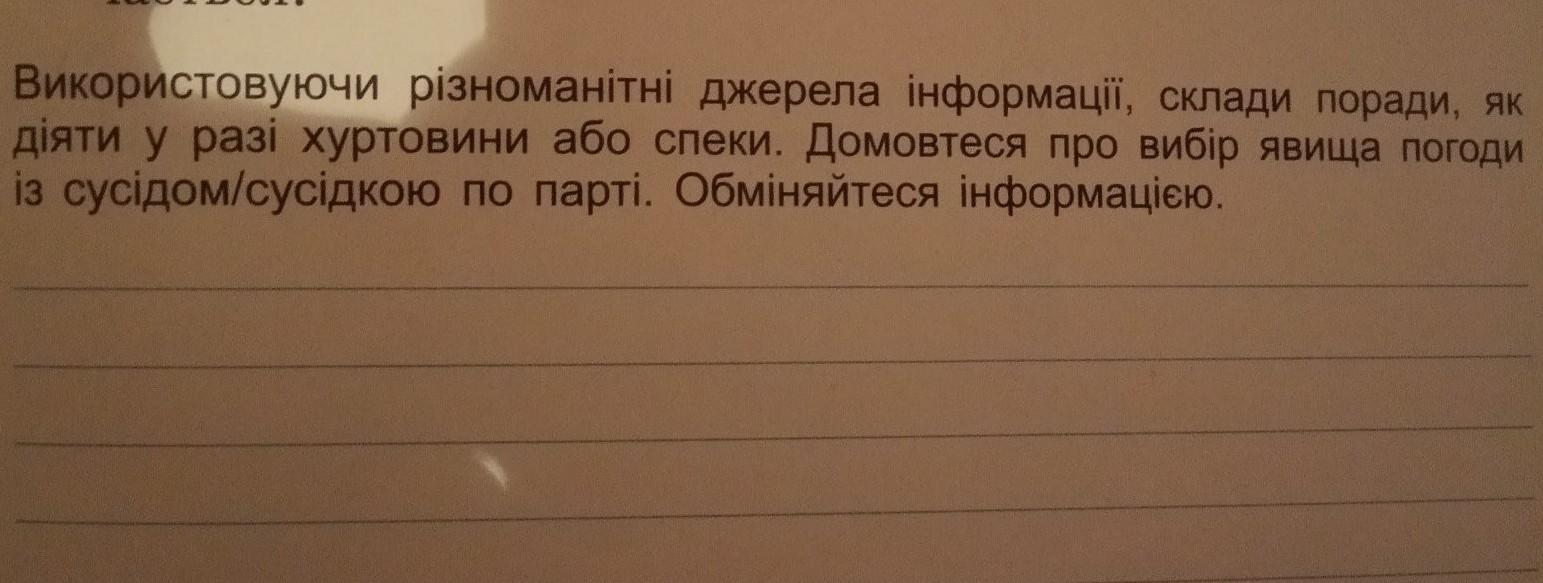 Використовуючи різноманітні джерела інформації, склади поради, як діяти у разі хуртовини або спеки. Домовтеся про вибір явища погоди із сусідом/сусідкою по парті. Обміняйтеся інформацією.