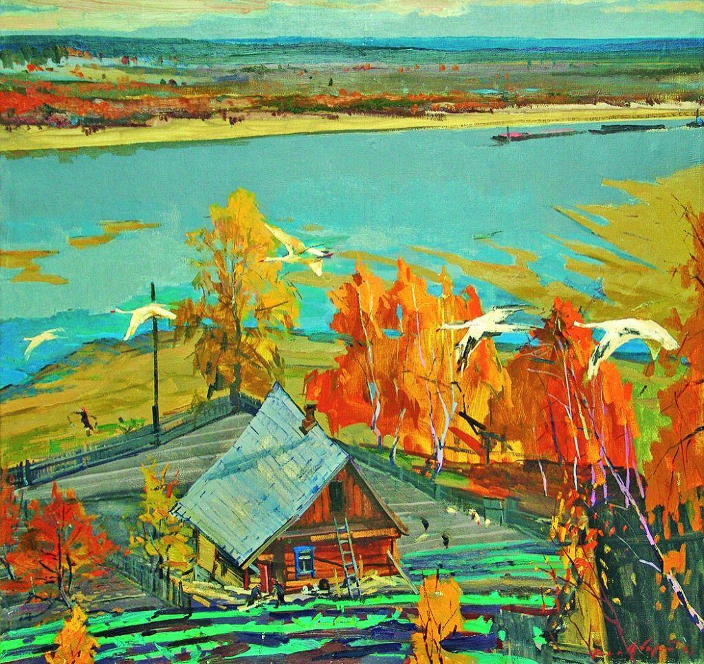 Для композиции автор выбрал вид на берег реки. С высоты птичьего полета мы видим сельский дом с садом и огородом. Люди завершают сбор картофеля, а на переднем плане салатными росчерками зеленеют капустные гряды. Теплые краски сруба перекликаются с осенним убранством сада и березняка за оградой. По светлой крыше скользят тени белых птиц, что, расправив могучие крылья, спешат к югу.
