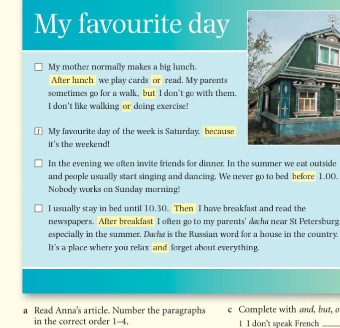I usually stay in bed until 10.30. Then I have breakfast and read the newspapers. After breakfast I often go to my parents' dacha near St Petersburg especially in the summer. Dacha is the Russian word for a house in the country It's a place where you relax and forget about everything.