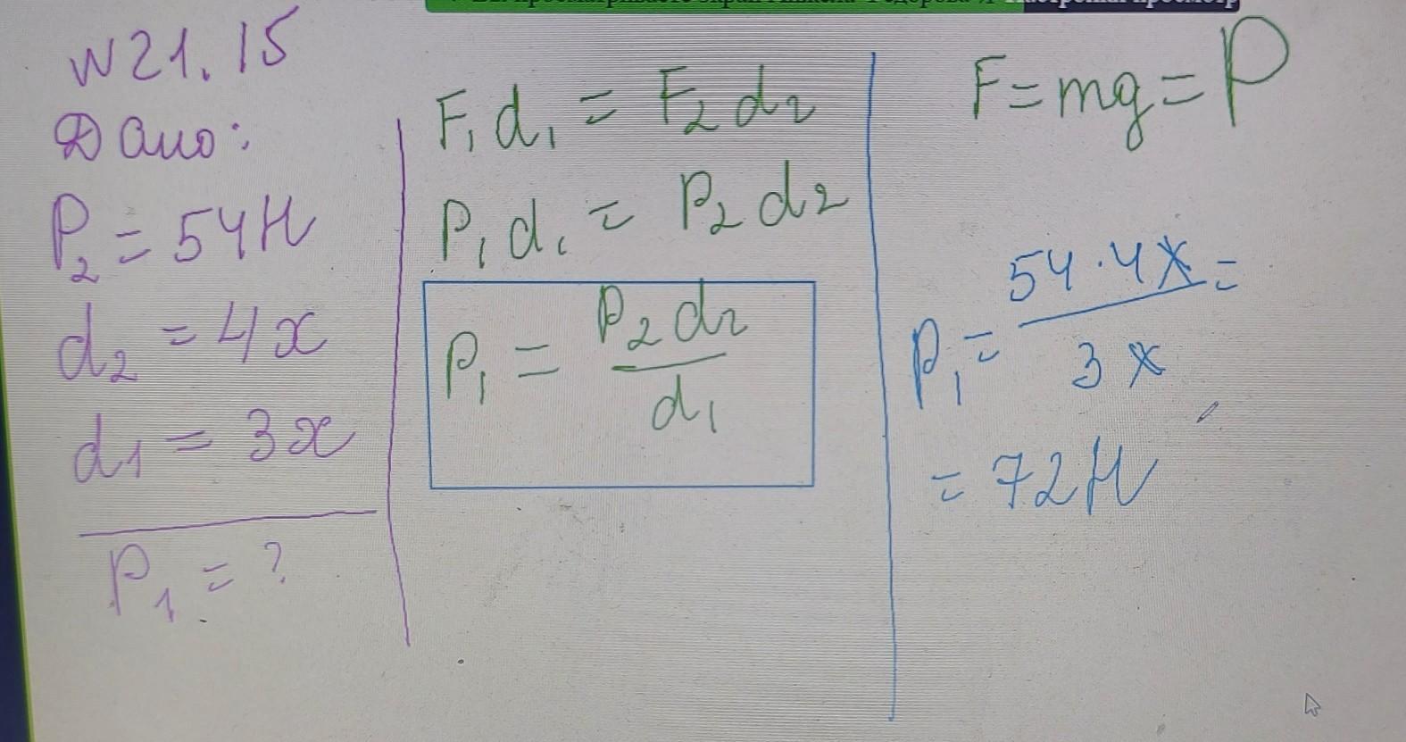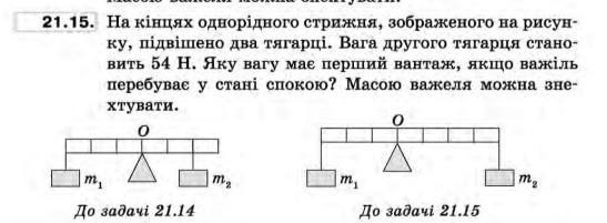 На них однорідного стрижня, зображеного на рисунку, підвішено два тягарці. Вага другого тягарця становить 54 Н. Яку вагу має перший вантаж, якщо важіль перебуває у стані спокою? Масою важеля можна знехтувати.