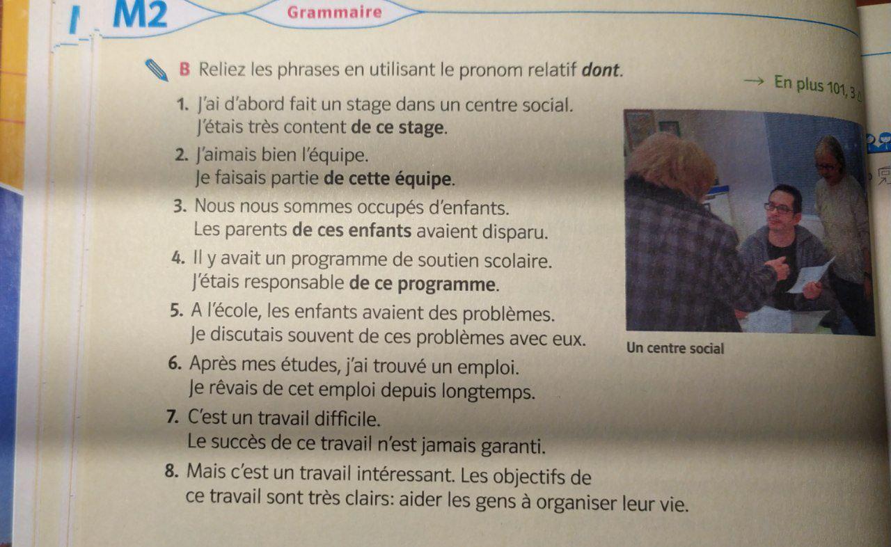 Відповідь: 1 dont ce stage 2 dont cette equipe 3 dont ce programme 4 dont ces problemes aves eux 5 dont cet empiol...... 6 dont cet empiol..... 7 dont ce travail.... 8 dont ce travail.... і так далі пишеш все спочатку потім ти пишеш оці відповіді.