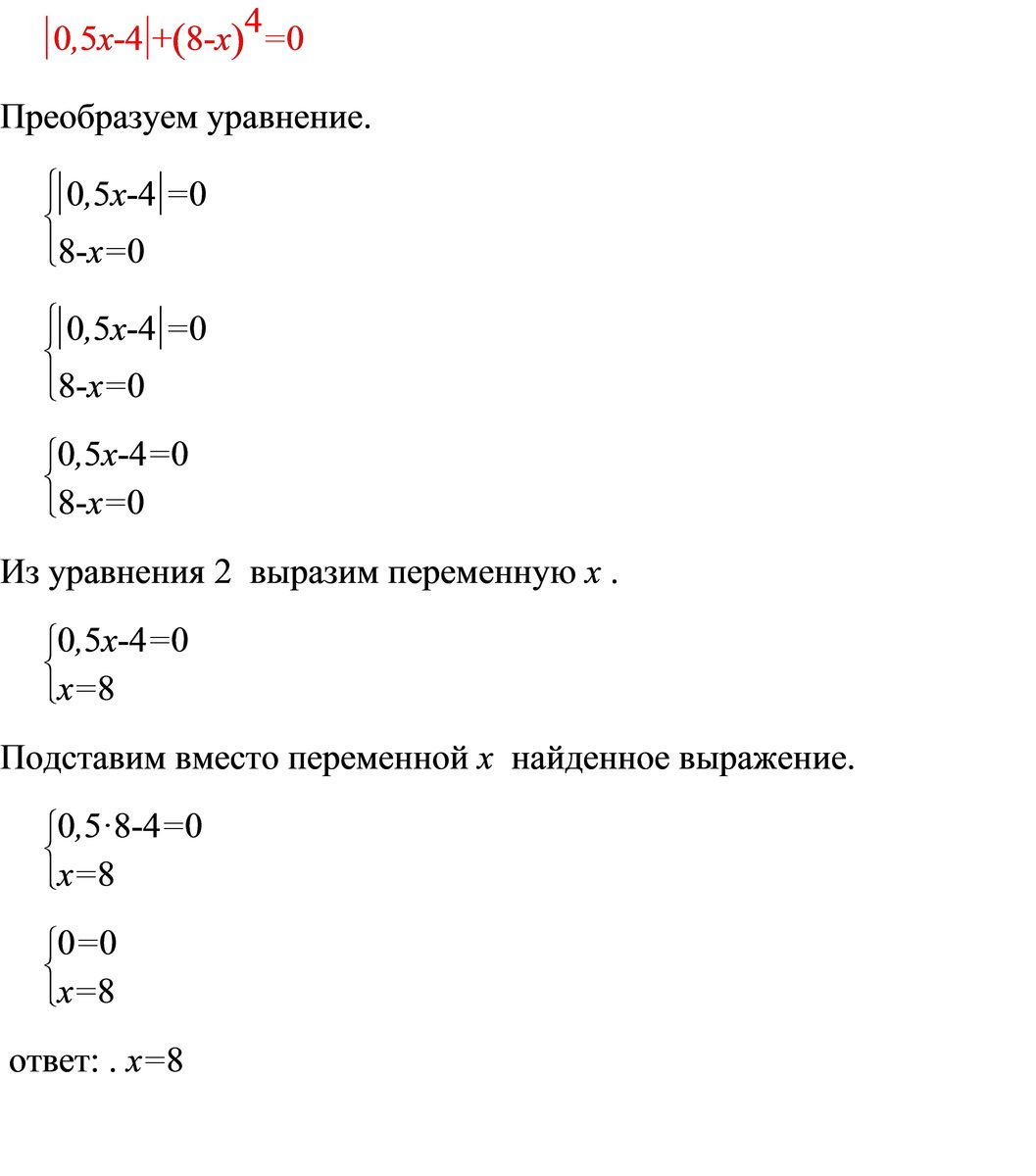 а)|0,5x-4|+(8-x)(*четвёртая степень*)=0 б) 8/2+|x|=4+x (*в квадрате*). РЕШИТЕ УРАВНЕНИЯ ПОЖАЛУЙСТА :|