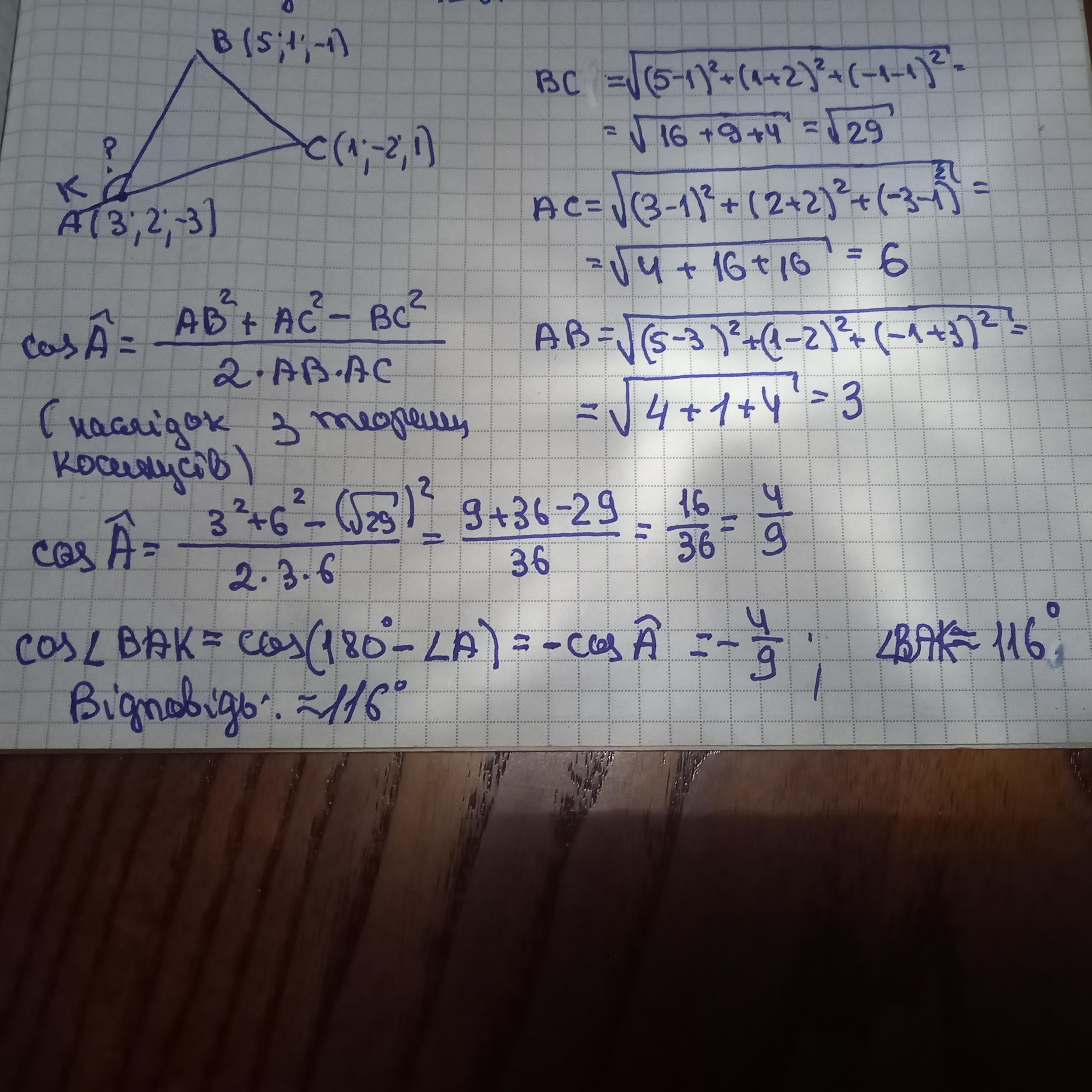 Дано вершини трикутника А (3; 2; -3) В (5; 1; -1) С ( 1; -2; 1). Знайдіть його зовнішній кут при вершині А