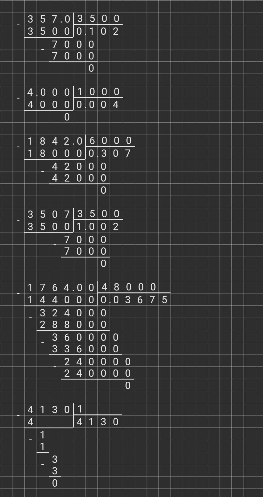643. Найдите значение выражения: 1)-35,7: 350; 4)-0,4 : 100; 2)-184,2 (-600); 3) 350,7 : (-350); 6)-17,64: 480. 5) 41,3 (-0,01); Столбиком пж