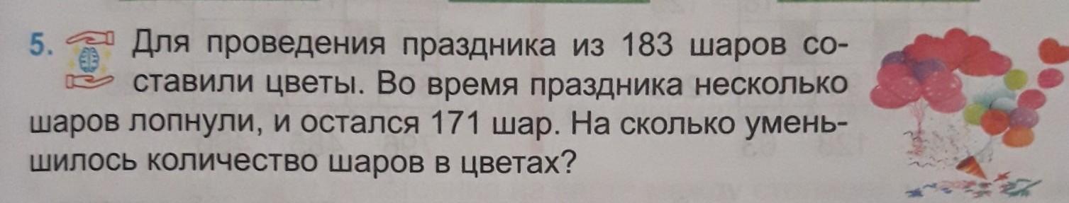 5. Для проведения праздника из 183 шаров со- ставили цветы. Во время праздника несколько шаров лопнули, и остался 171 шар. На сколько умень- шилось количество шаров в цветах?