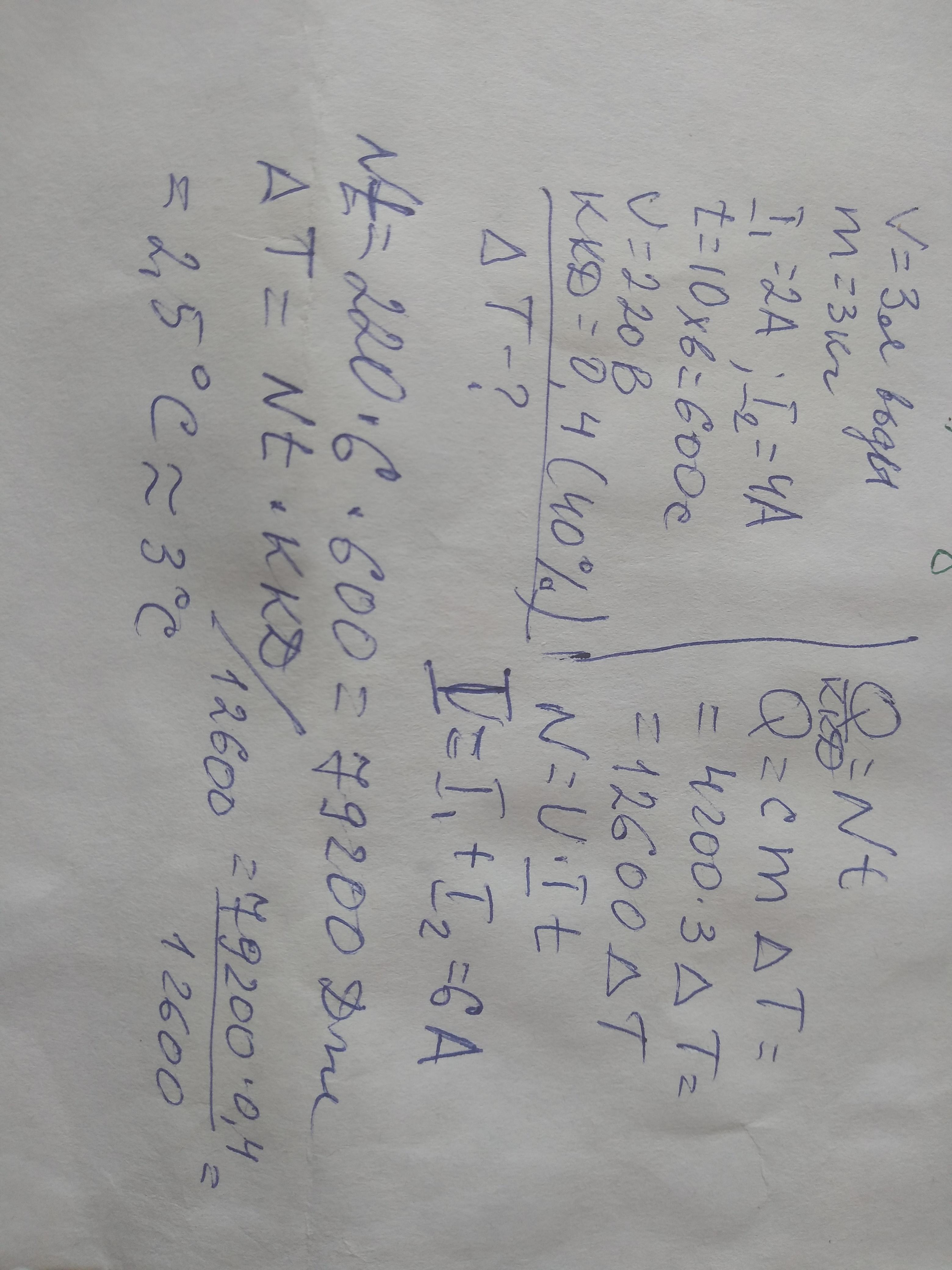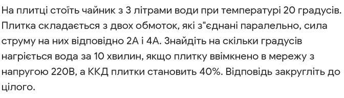 Плитка складається з двох обмоток, які з"еднані паралельно, сила струму на них відповідно 2А і 4А. Знайдіть на скільки градусів нагріється вода за 10 хвилин, якщо плитку ввімкнено в мережу з напругою 220B, а ККД плитки становить 40%. Відповідь закругліть до цілого.