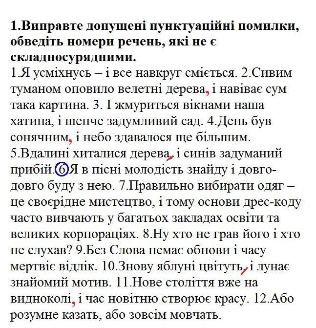 1.Виправте допущені пунктуаційні помилки, обведіть номери речень, які не є складносурядними 1.Я усміхнусь – і все навкруг сміється. 2.Сивим туманом оповило велетні дерева і навіває сум така картина. 3. І жмуриться вікнами наша хатина, і шепче задумливий сад. 4.День був сонячним і небо здавалося ще більшим. 5.Вдалині хиталися дерева, і синів задуманий прибій. 6.Я в пісні молодість знайду і довго-довго буду з нею. 7.Правильно вибирати одяг – це своєрідне мистецтво, і тому основи дрес-коду часто вивчають у багатьох закладах освіти та великих корпораціях. 8.Ну хто не грав його і хто не слухав? 9.Без Слова немає обнови і часу мертвіє відлік. 10.Знову яблуні цвітуть, і лунає знайомий мотив. 11.Нове століття вже на видноколі і час новітню створює красу. 12.Або розумне казать, або зовсім мовчать.