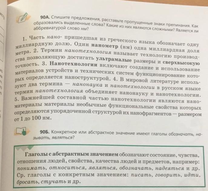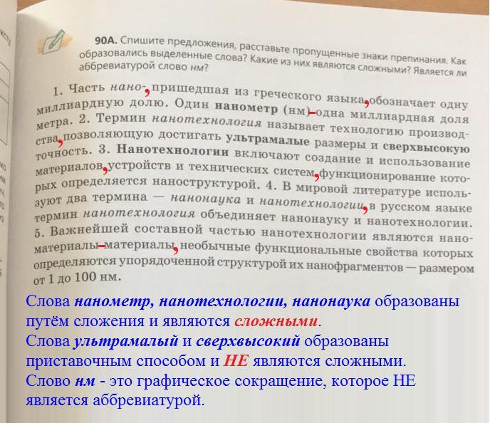 90А. Спишите предложения, расставьте пропущенные знаки препинания. Как образовались выделенные слова? Какие из них являются сложными? Является ли аббревиатурой слово нм? 1. Часть нано- пришедшая из греческого языка обозначает одну миллиардную долю. Один нанометр (нм) одна миллиардная доля ства позволяющую достигать ультрамалые размеры и сверхвысокую метра. 2. Термин нанотехнология называет технологию производ- точность. 3. Нанотехнологии включают создание и использование материалов устройств и технических систем функционирование кото- рых определяется наноструктурой. 4. В мировой литературе исполь- зуют два термина нанонаука и нанотехнологии в русском языке термин нанотехнология объединяет нанонауку и нанотехнологии. 5. Важнейшей составной частью нанотехнологии являются нано- материалы материалы необычные функциональные свойства которых определяются упорядоченной структурой их нанофрагментов - размером от 1 до 100 нм.
