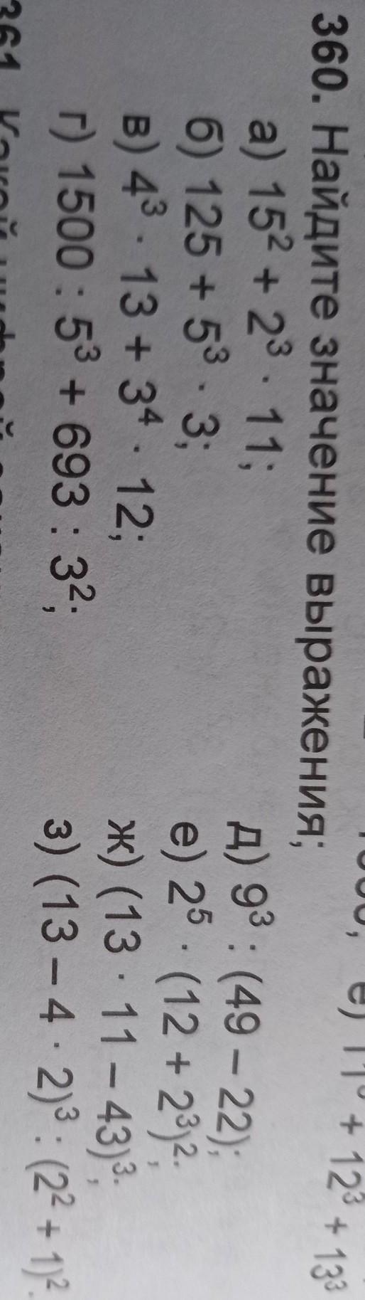 выражения; a) 15² + 2³. 11; 6) 125 + 5³ - 3; B) 43 13 +34 12; r) 1500: 5³ + 693 : 3²; Д) 93 : (49 - 22); e) 25. (12 + 23)2; 1143)³; x) (13 3) (13-4 2)³ (2² + 1)²