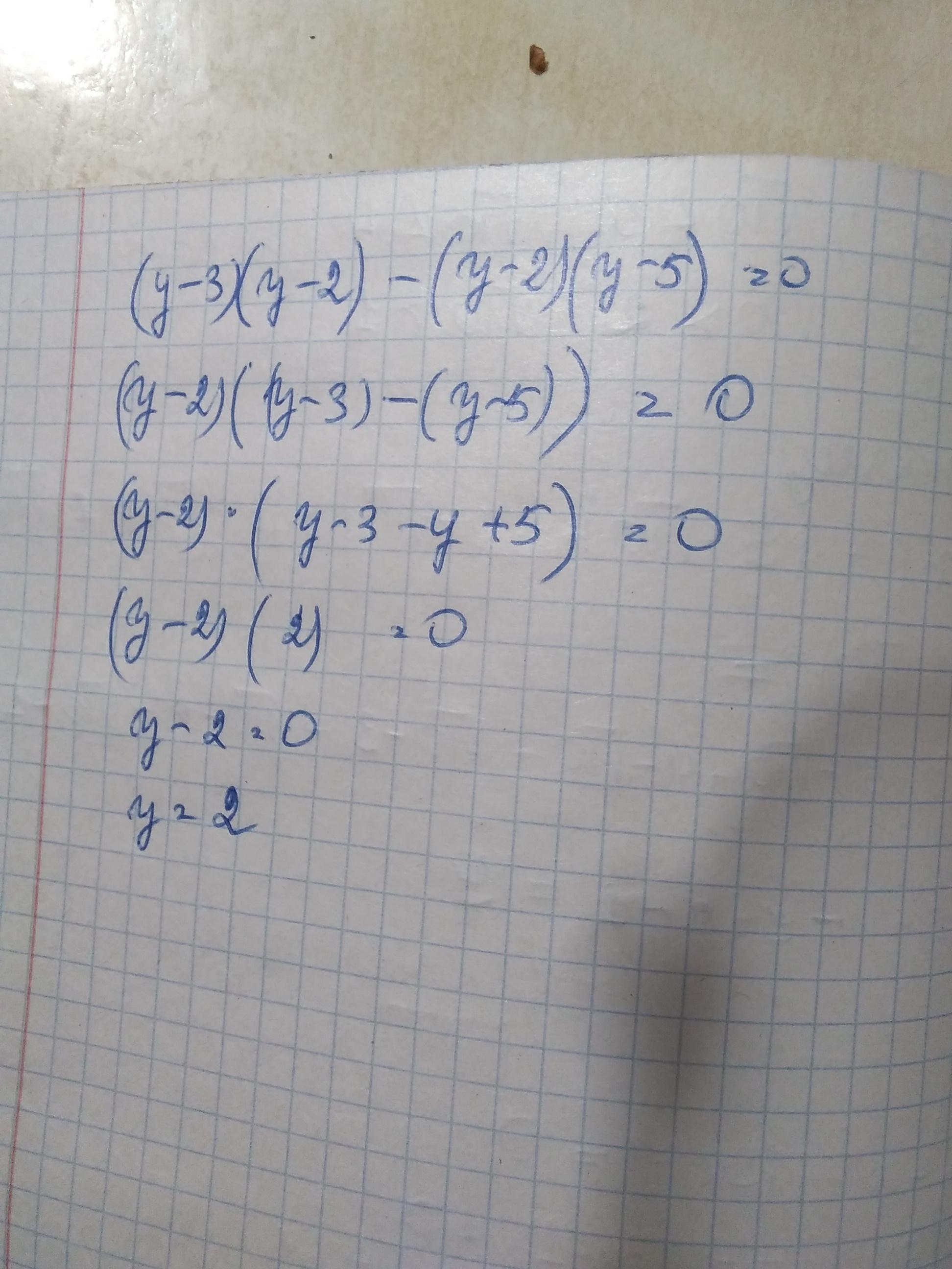 Розв'яжіть рівняння (y-3)(y-2)-(y-2)(y-5)=0