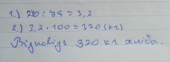 Масса муки,которая пошла на выпечку хлеба,составляет 75% от выпеченного хлеба.Сколько хлеба получится из 240 кг муки.ПОМОГИТЕ РЕШИТЬ