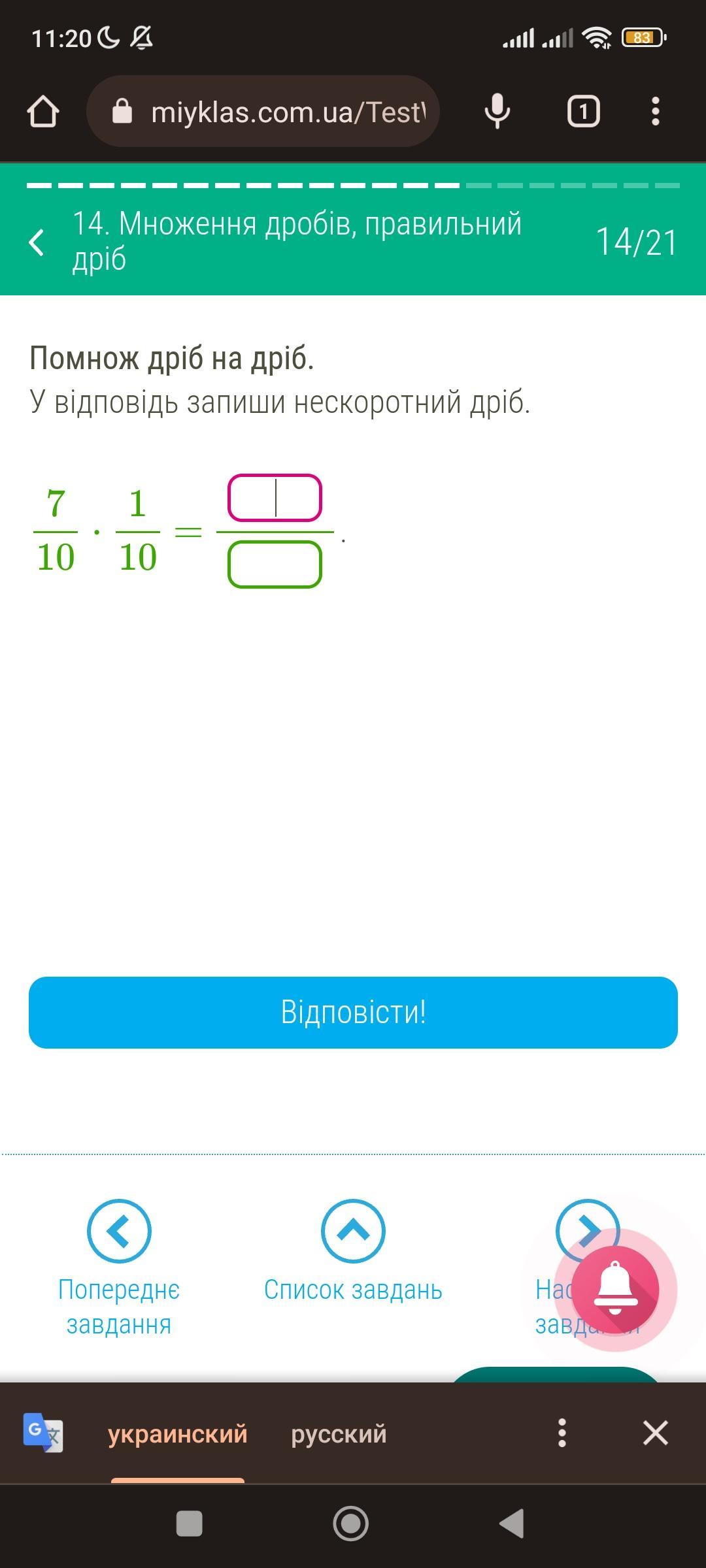 ну ми перемеожцємо чисельники знаменник одний і той самий відповідь 7/10