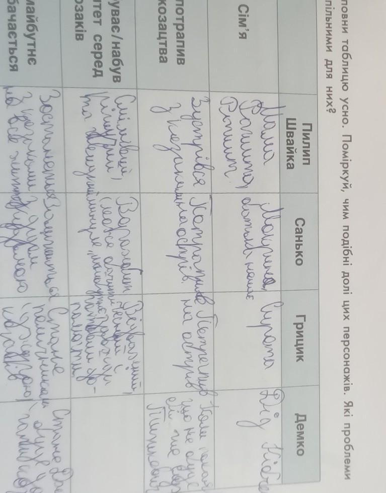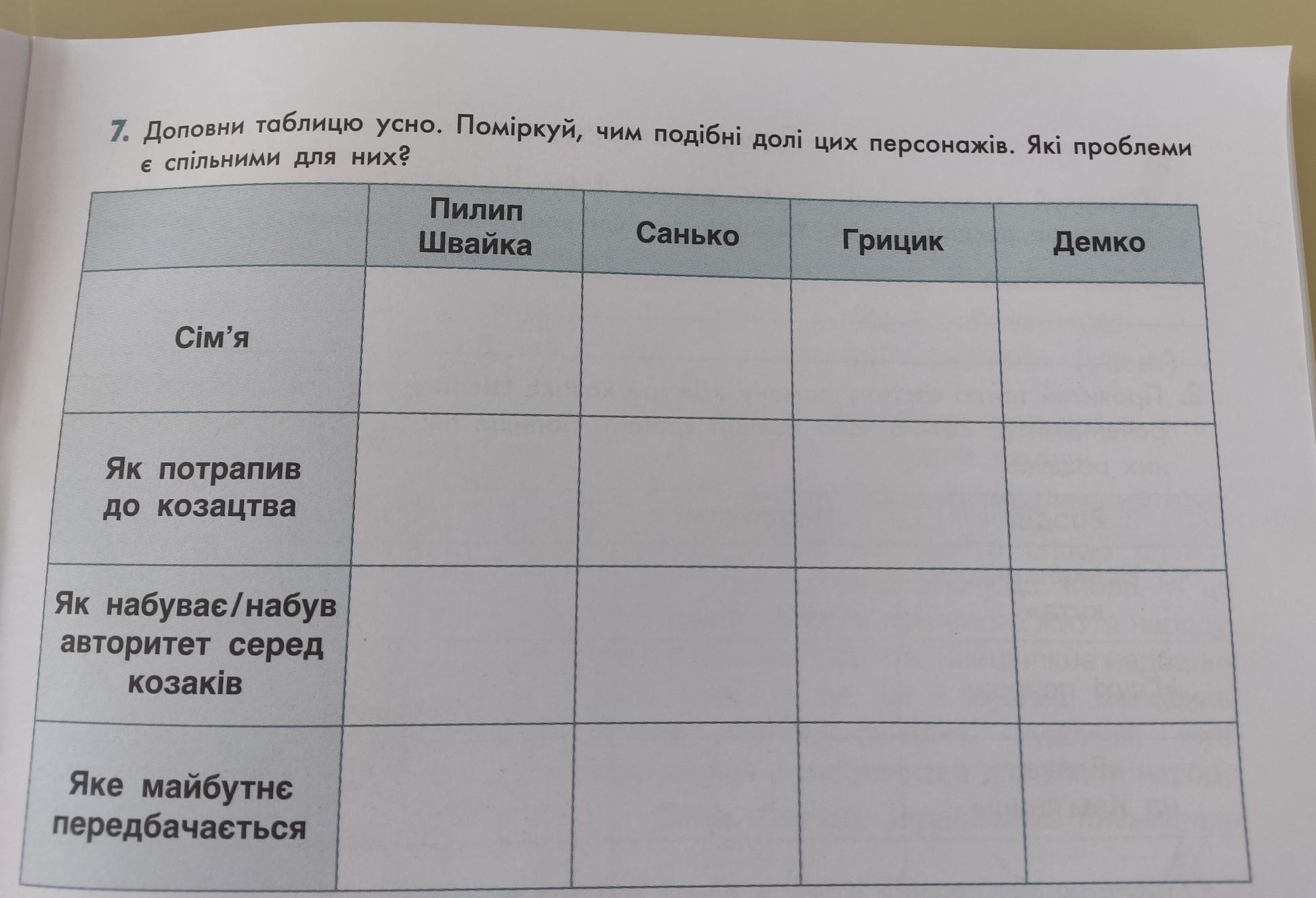 7. Доповни таблицю усно. Поміркуй, чим подібні долі цих персонажів. Які проблеми є спільними для них? Сім'я Як потрапив до козацтва Як набуває/набув авторитет серед козаків Яке майбутнє передбачається Пилип Швайка Санько Грицик Демко