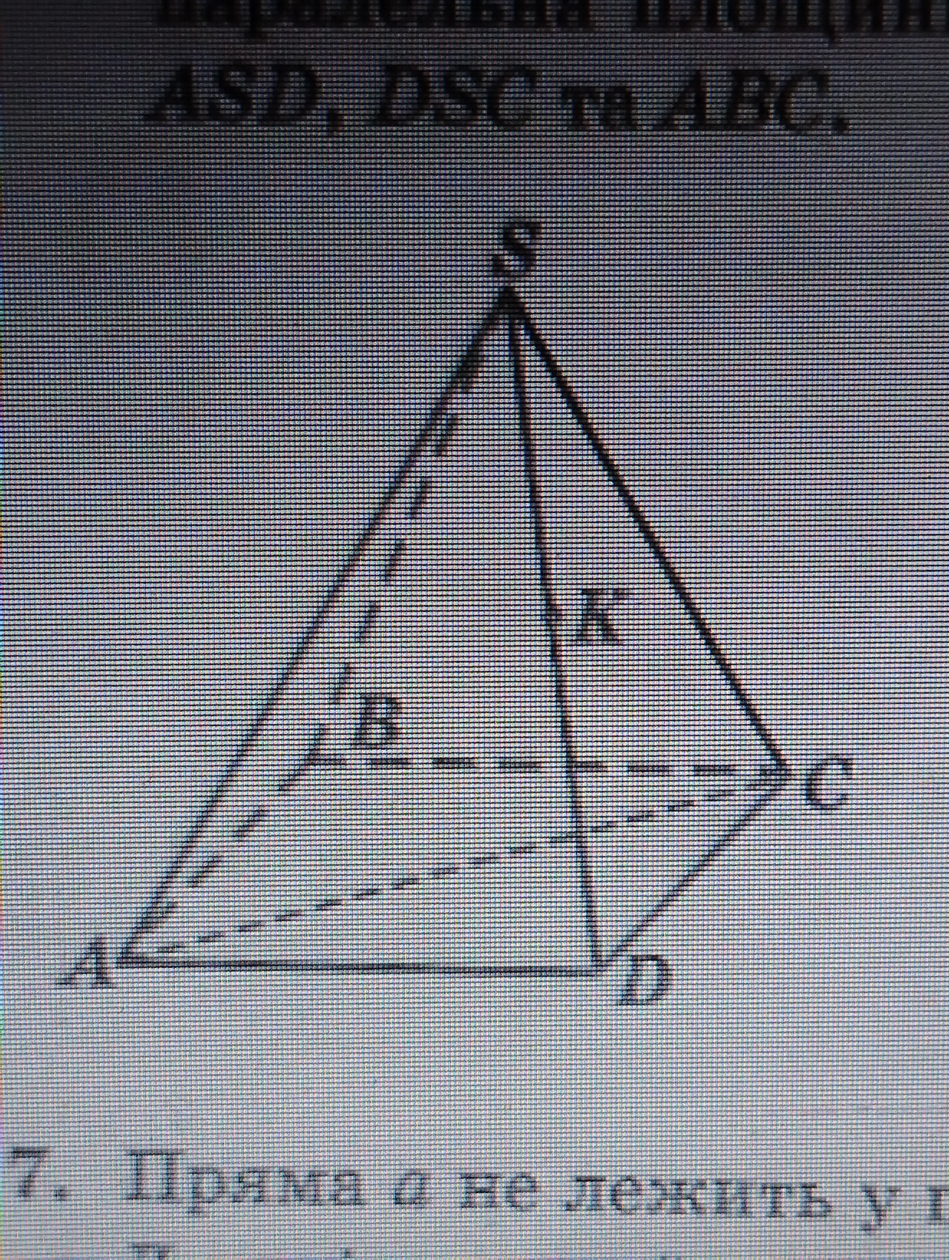 Точка К належить ребру SD піраміди SABCD. Площина β проходить через точку К і паралельна площині ASC. Побудуйте прямі, по яких площина β перетинає площини ASD, DSC та АВС.