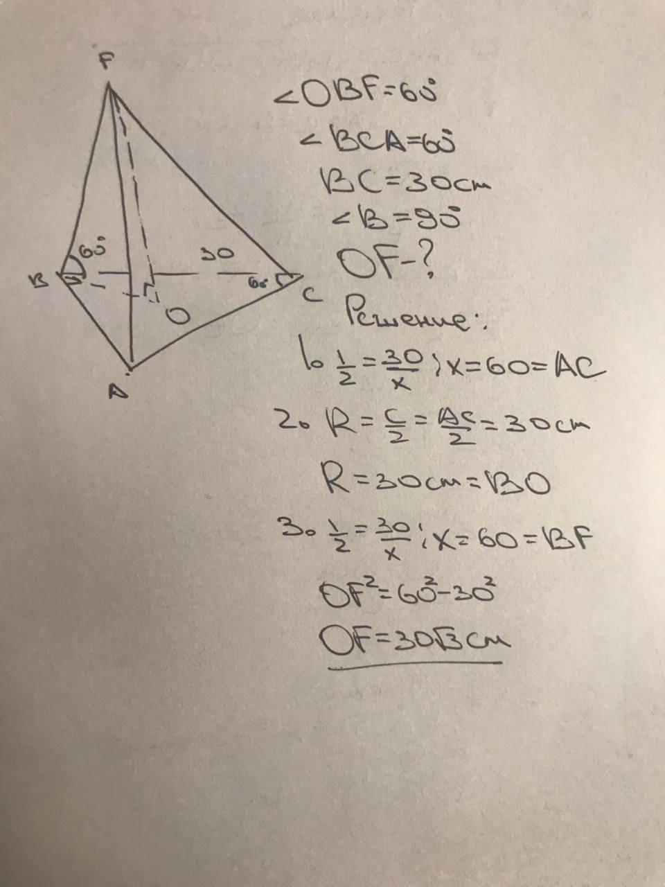 Основою піраміди є прямокутний трикутник із кутом 60° і прилеглим катетом, довжина якого дорівнює 30 см. Бiчнi ребра утворюють із пло- щиною основи кути 60°. Знайдіть висоту піраміди.