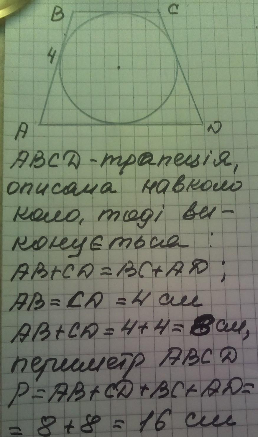 Бічна сторона рівнобічної трапеції, описаної навколо кола. дорівнює 4 см. Знайдіть периметр трапеції.