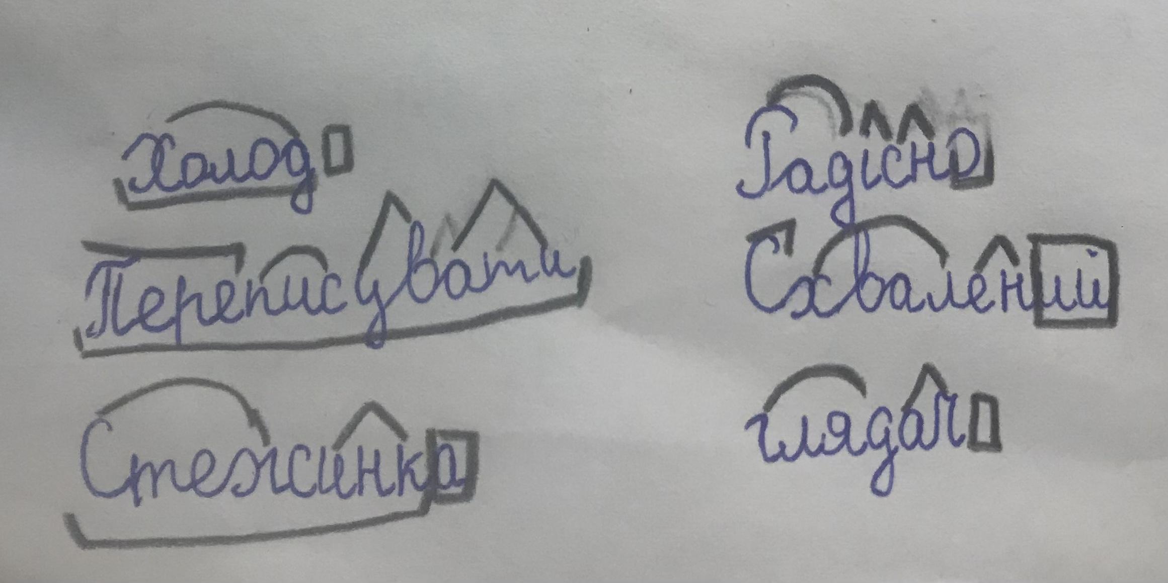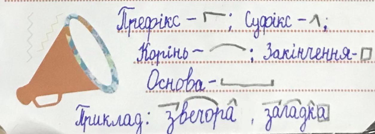 На першому фото показано, як що позначається. На другому - розібрані за будовою слова.