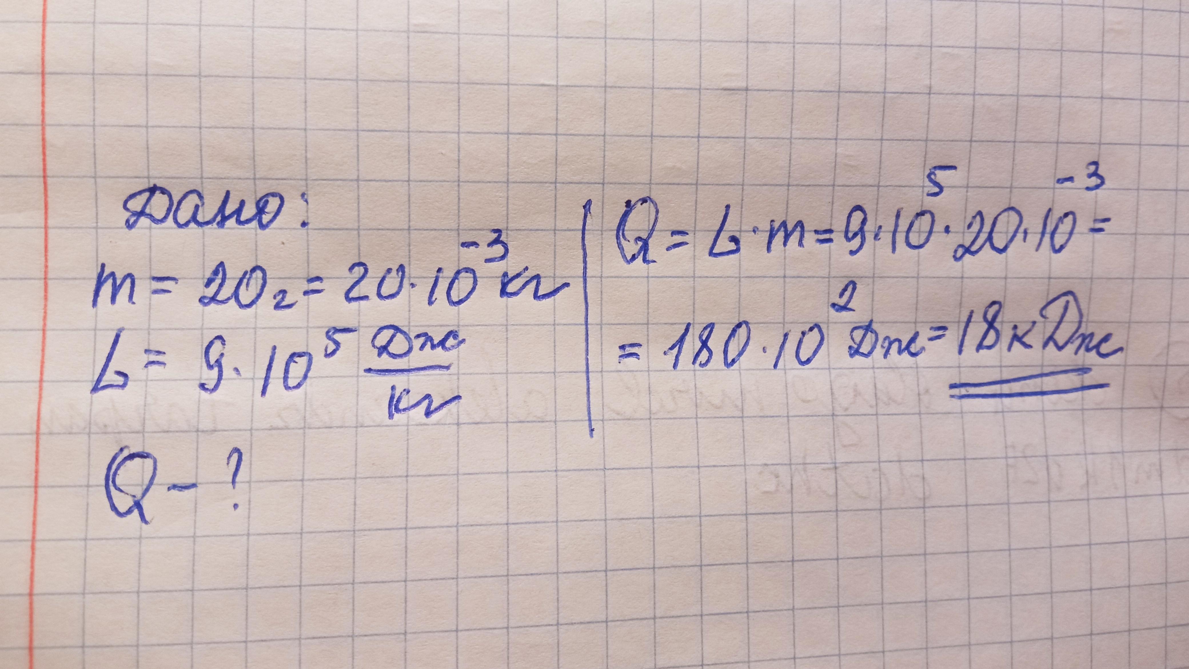 Q=L*m=9*10^5*20*10^(-3)Дж=180*10²=18кДж.