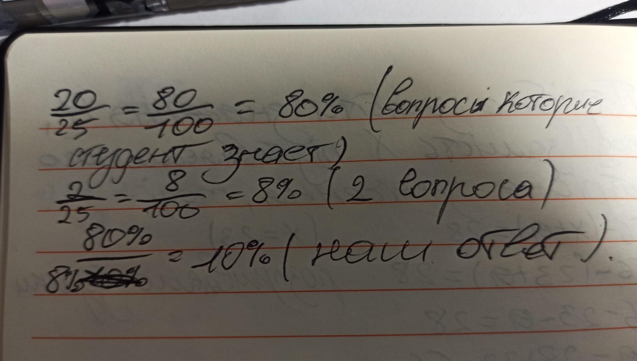 Студент пришёл на экзамен, зная лишь 20 вопросов из 25-ти. Преподаватель наугад дал 2 вопроса. Какова вероятность, что студент получил вопросы, которые он выучил?