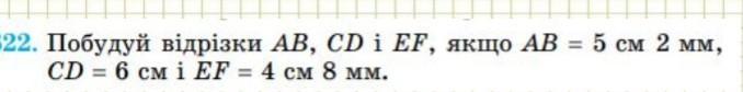 622. Побудуй відрізки AB, CD і EF, якщо AB = 5 см 2 мм, CD = 6 см і EF = 4 см 8 мм.