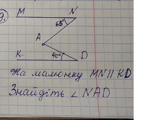 если провести линию с точки N до D получится треугольник NAD тогда будет ясно, что N и D углы 90°, так как MN||KD, то есть 90-65=25°