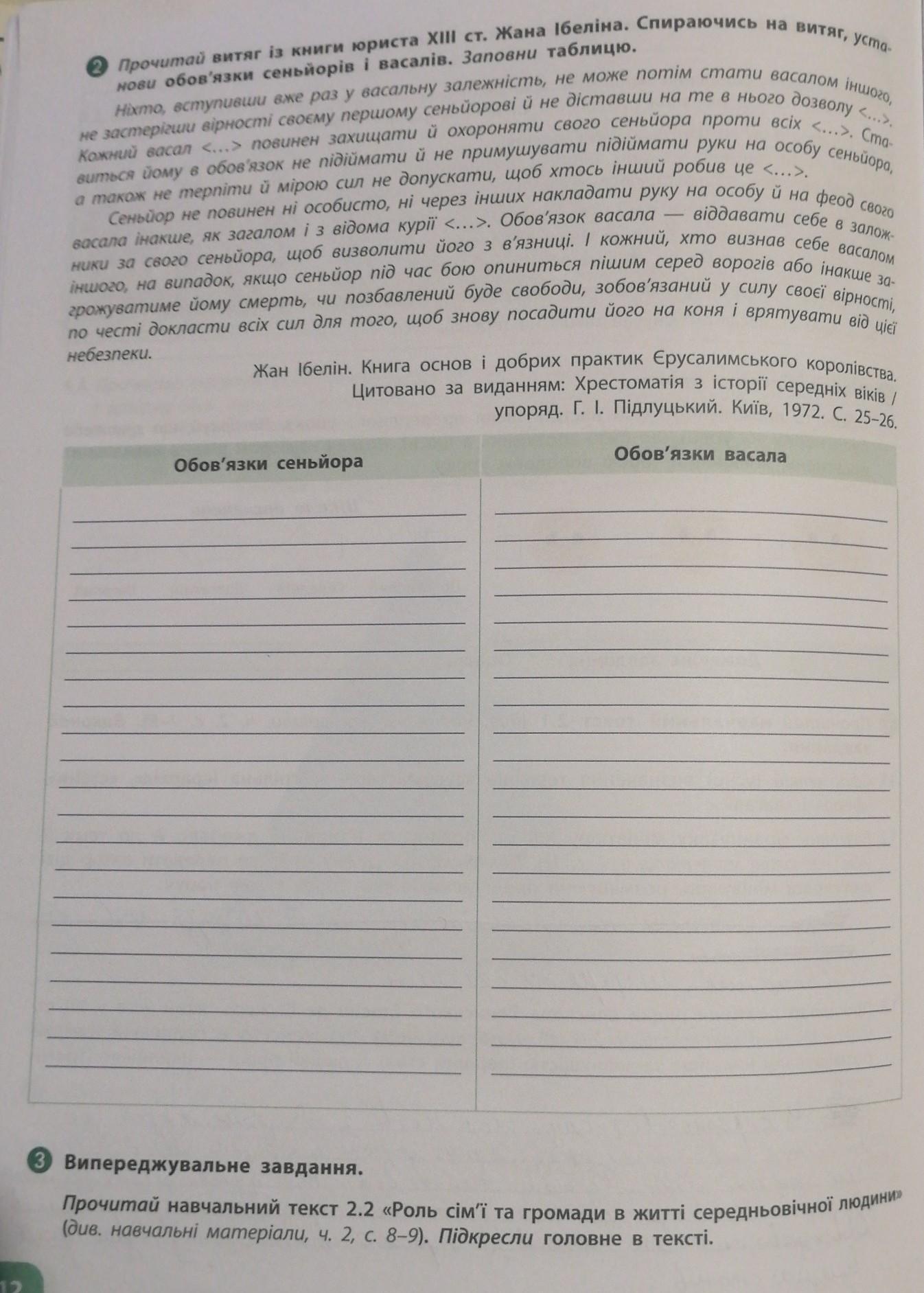 2 Прочитай витяг із книги юриста ХIII ст. Жана Ібелiна. Спираючись на витяг, уста- нови обов'язки сеньйорів і васалів. Заповни таблицю. не застерігши вірності своєму першому сеньйорові й не діставши на ме в нього дозволу . Ніхто, вступивши вже раз у васальну залежність, не може потім стати васалом іншого. Кожний васал повинен захищати й охороняти свого сеньйора проти всіх Ста виться йому в обов'язок не підіймати й не примушувати підіймати руки на особу сеньйора, а також не терпіти й мірою сил не допускати, щоб хтось інший робив це . Сеньйор не повинен нi особисто, ні через iнших накладати руку на особу й на феод свого віддавати себе в залож- васала інакше, як загалом і з відома курiï . Обов'язок васала ники за свого сеньйора, щоб визволити його з в'язниці. І кожний, хто визнав себе васалом іншого, на випадок, якщо сеньйор під час бою опиниться пішим серед ворогів або інакше за- грожуватиме йому смерть, чи позбавлений буде свободи, зобов'язаний у силу своєї вірності, по честі докласти всiх сил для того, щоб знову посадити його на коня і врятувати від цієї небезпеки. Жан Ібелiн. Книга основ і добрих практик Єрусалимського королівства. Цитовано за виданням: Хрестоматія з історії середніх віків / упоряд. Г. 1. Підлуцький. Київ, 1972. С. 25-26. Обов'язки васала Обов'язки сеньйора