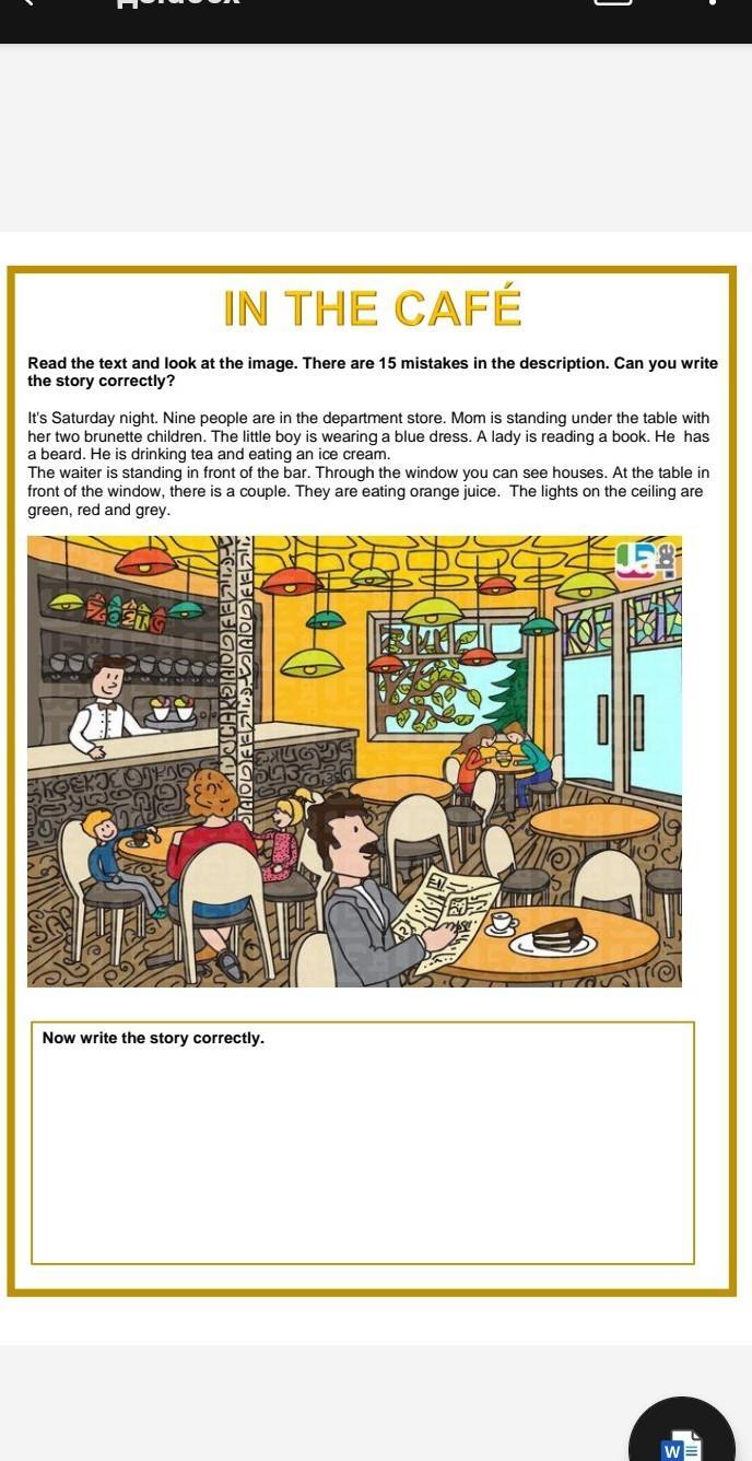 its Saturday day. Six people are in the cafe. Mom is sitting on the table, with her children. the little boy is wearing a blue blouse. A man is reading newspaper. he has a moustache. he's drinking a coffee, and eating cake. the bartender is standing in the bar. through the window u can see the trees. at the table in front of window, there are couple. they are drinking juice. the lights in the cafe are yellow, green, and orange.